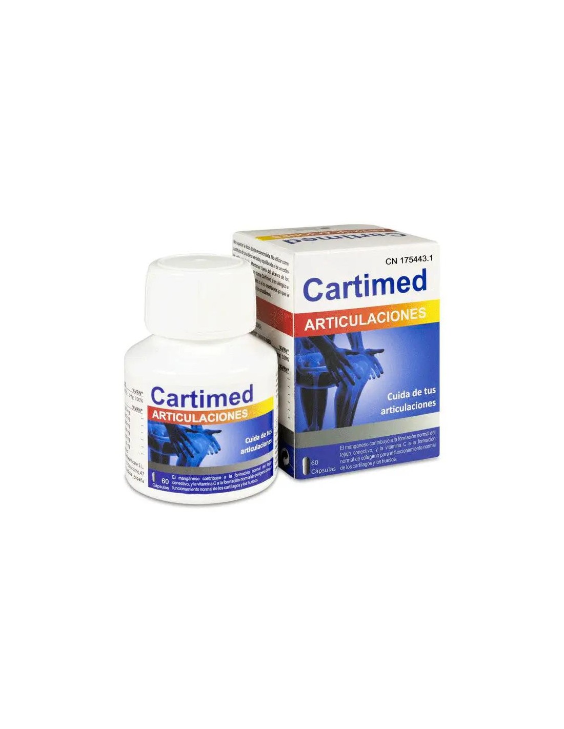 Cartimed Articulaciones, 60 Cápsulas es un complemento alimenticio qué contribuye al mantenimiento y recuperación de las articulaciones. Está elaborado con ácido hialurónico, colágeno, condroitina, glucosamina, harpagofito, vitamina C, manganeso y metilsulfonilmetano. Componentes que ayudan a mejorar el funcionamiento, no solo de las articulaciones, sino también de los huesos, músculos y ligamentos.