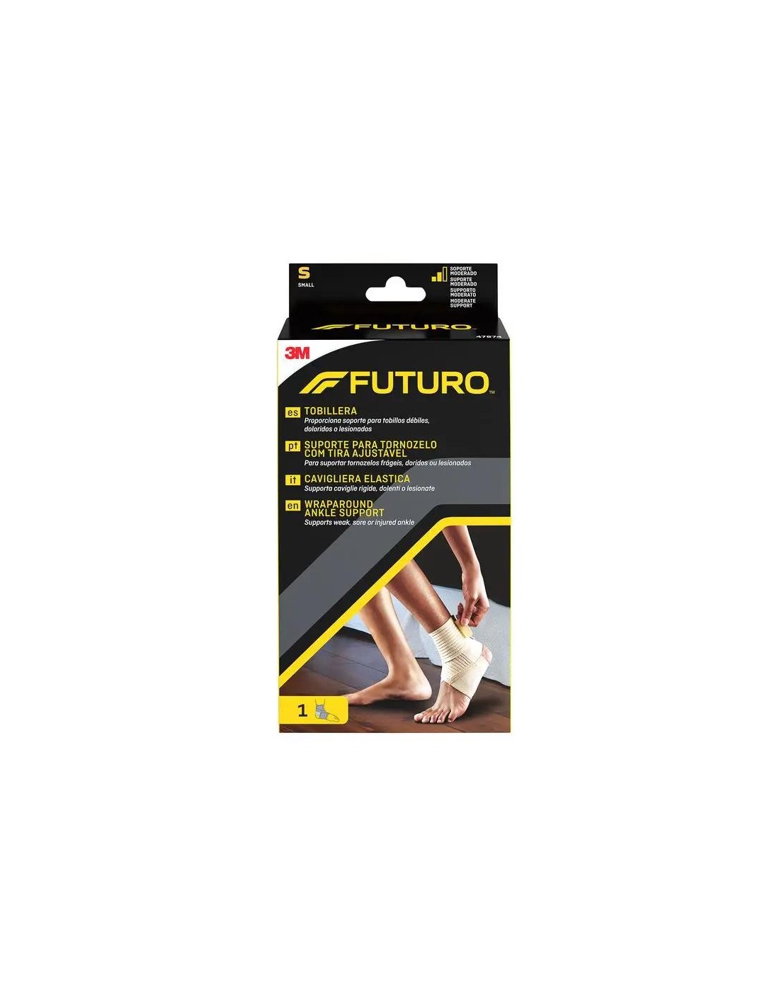 La tobillera talla S marca Futuro, fabricada por la empresa 3M, es un producto textil hecho a partir de una combinación de fibras textiles elásticas que permiten brindar un ajuste cómodo y moderado para ayudar a personas con tobillos débiles o lesionados. Puede ser usada en ambos pies, solo con la condición de que a la hora de su aplicación la tira o gasa, quede en dirección a la cara externa del pie.