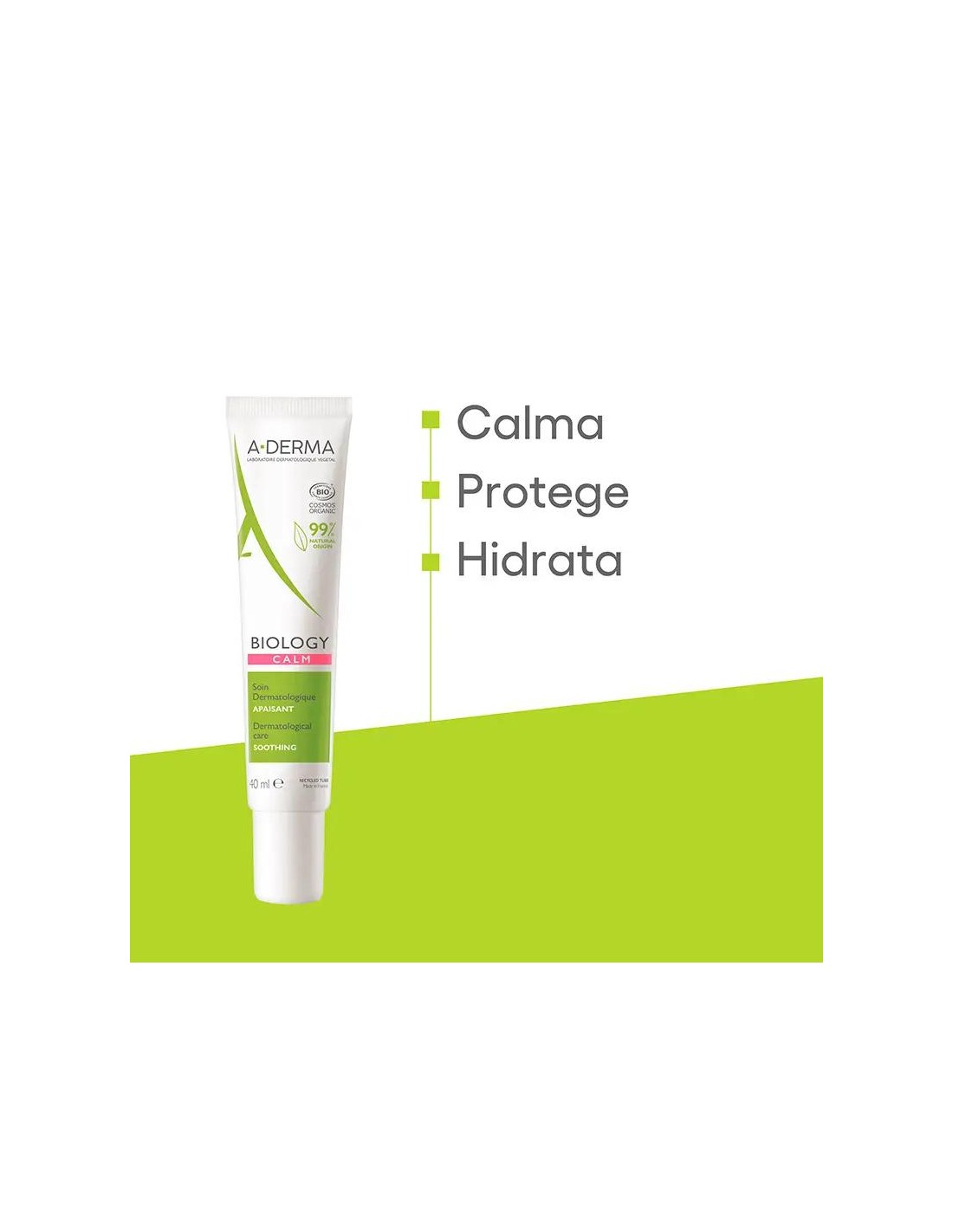 "La piel reactiva e intolerante, que ya no tolera nada (molestias, sobrecalentamiento, tirantez, etc.), necesita un producto de cuidado facial eficaz y seguro. El Laboratorio A-Derma ha formulado el CUIDADO DERMATOLÓGICO CALMANTE BIOLOGY CALM, un producto de cuidado dermatológico de tolerancia óptima con certificado ecológico, adecuado para la piel frágil. Combinando la Nuez de Cola con el ingrediente activo clave de la gama BIOLOGY, la Savia de Avena Rhealba® Orgánica, alivia y reduce las sensaciones de molestias de forma inmediata y duradera, y protege contra las agresiones externas al tiempo que proporciona 24 h³ de hidratación. El CUIDADO DERMATOLÓGICO CALMANTE BIOLOGY CALM, con una fórmula de origen 99% natural, solo contiene los ingredientes esenciales para asegurar una tolerancia óptima. Probado en piel alérgica e intolerante, su fórmula sin perfume ni aceites esenciales puede aplicarse en el rostro y el contorno de ojos. Su textura fluida, de efecto fresco y no comedogénica, puede utilizarse sola o en combinación (de 1 a 3 gotas) con las cremas dermatológicas hidratantes BIOLOGY para un cuidado personalizado.