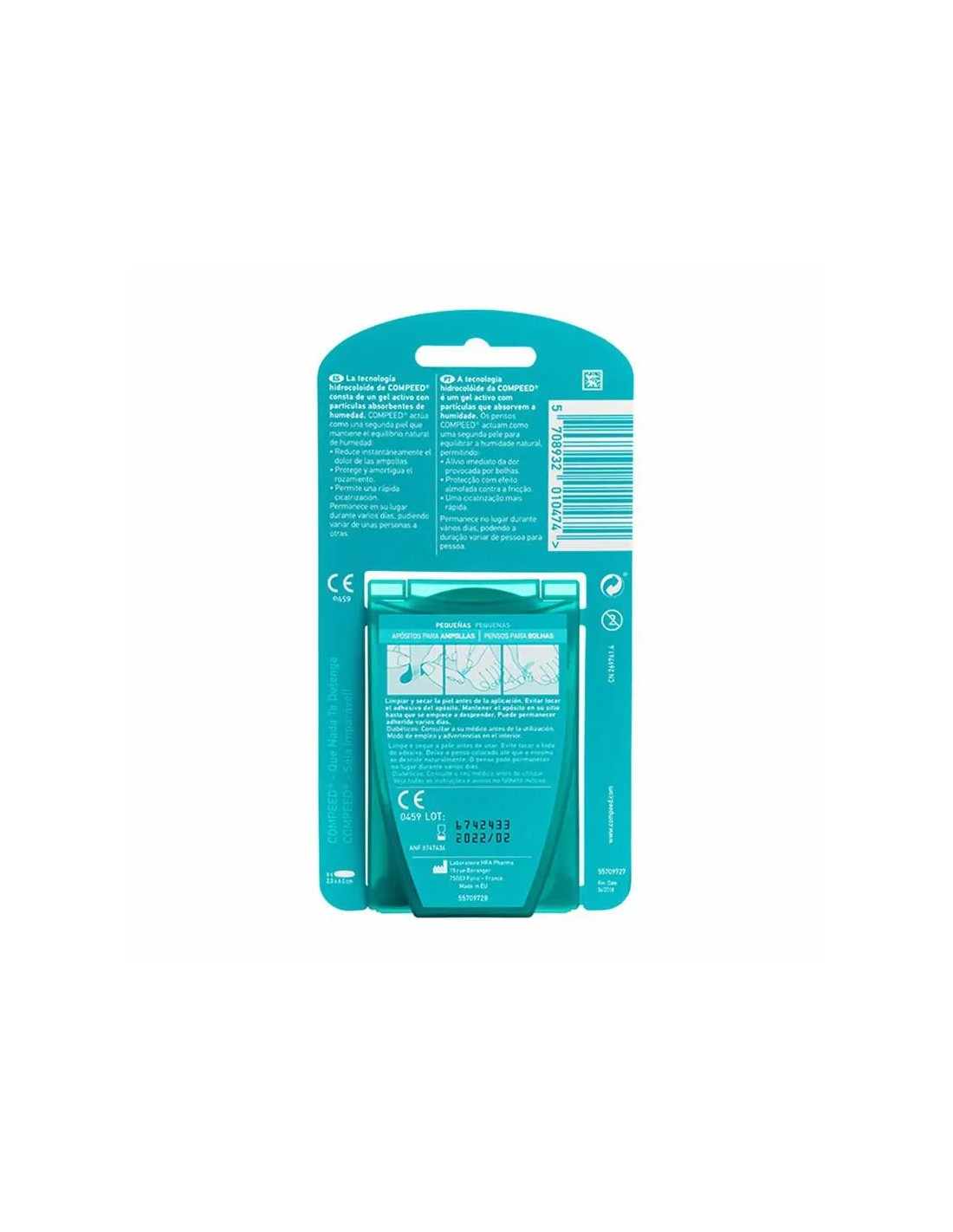 • Diabéticos: consulte a su médico antes del uso. • No aplicar sobre heridas infectadas. • Si la ampolla empeora o no se cura, consulte a su médico. • No reutilizar, para evitar infecciones. • Nunca cortar un apósito Compeed®. • Los residuos de adhesivo en la ropa se pueden eliminar con un disolvente suave, teniendo en cuenta las instrucciones especiales de cuidado del tejido. • Diseñado para adultos.