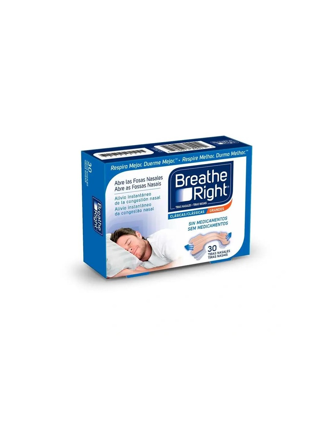 Breathe Right tira nasal color talla grande 30 unidades son tiras adhesivas diseñadas para ayudar en caso de congestión nocturna. Proporcionan alivio ante alergias, resfriados, rinitis y ronquidos. Están libres de medicamentos.